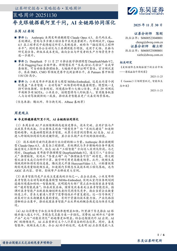 【东吴证券】【202511】策略周评 20251130 夸克眼镜搭载阿里千问,AI全链路协同深化-6页