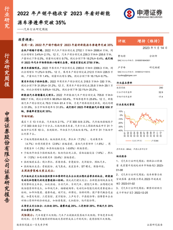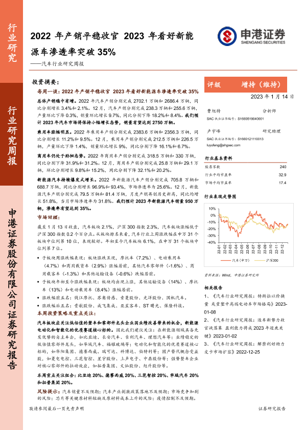 【申港证券】【20230114】汽车行业研究周报:2022年产销平稳收官 2023年看好新能源车渗透率突破35%-15页