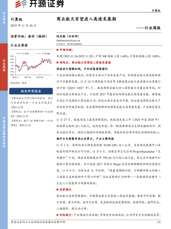 太空算力 人工智能 商业航天 政策催化 行业周报