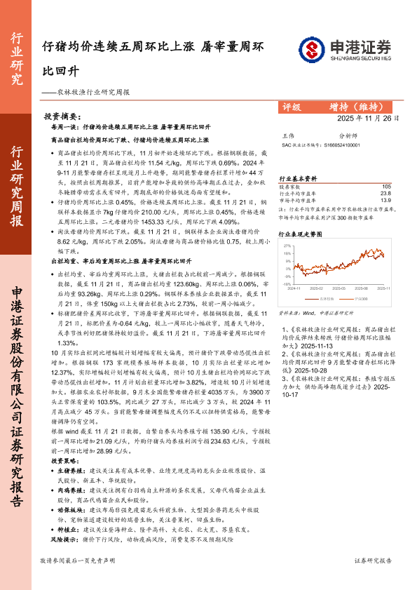 【申港证券】【202511】农林牧渔行业研究周报:仔猪均价连续五周环比上涨,屠宰量周环比回升-8页