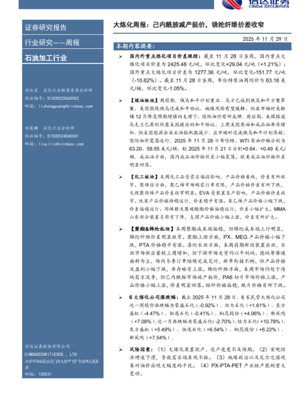 【信达证券股份有限公司 C INDASECUR IT IESCO.,LTD】【202511】大炼化周报:己内酰胺减产挺价,锦纶纤维价差收窄-25页