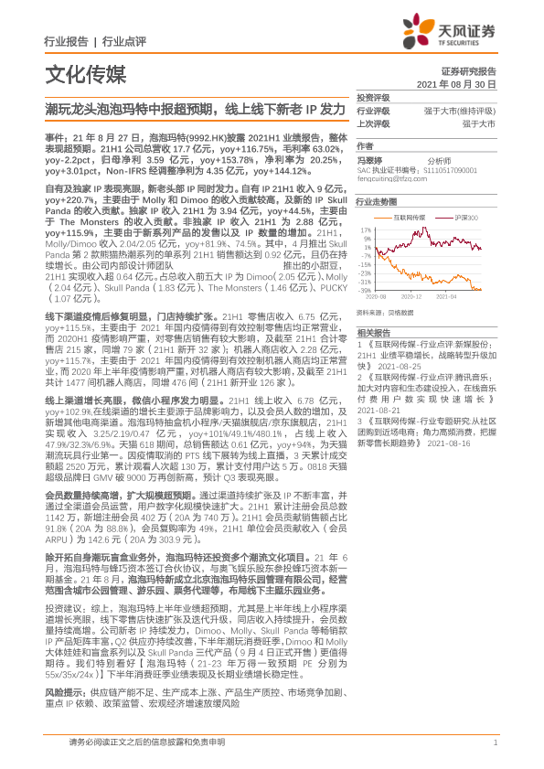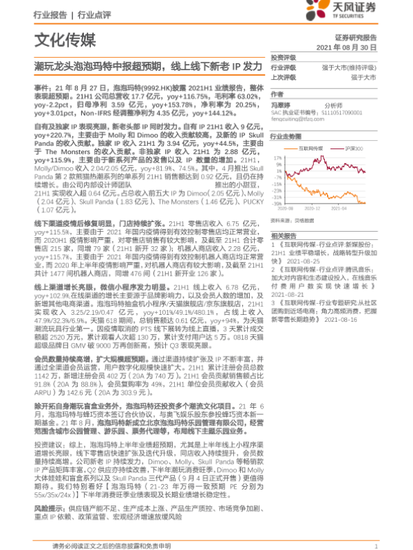 【天风证券】【20210830】文化传媒行业点评:潮玩龙头泡泡玛特中报超预期,线上线下新老IP发力-19页