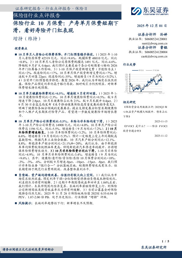 【东吴证券】【202512】保险Ⅱ行业点评报告·保险行业10月保费:产寿单月保费短期下滑,看好寿险开门红表现-5页