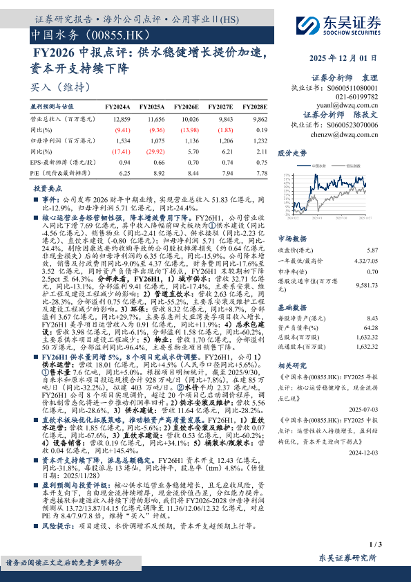 【东吴证券】【202512】FY2026中报点评:供水稳健增长提价加速,资本开支持续下降-3页