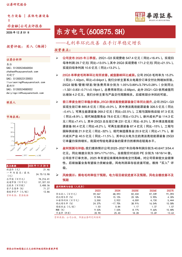 抽蓄业务 风电利润率提升 在手订单增长 煤电交付高峰 毛利率改善