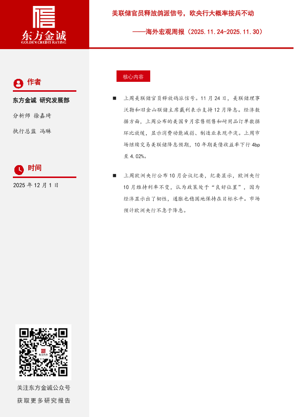 【东方金诚】【202512】海外宏观周报:美联储官员释放鸽派信号,欧央行大概率按兵不动-9页