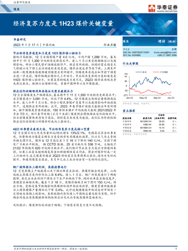 【华泰证券】【20230117】煤炭行业月报:经济复苏力度是1H23煤价关键变量-17页