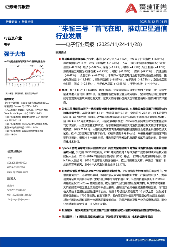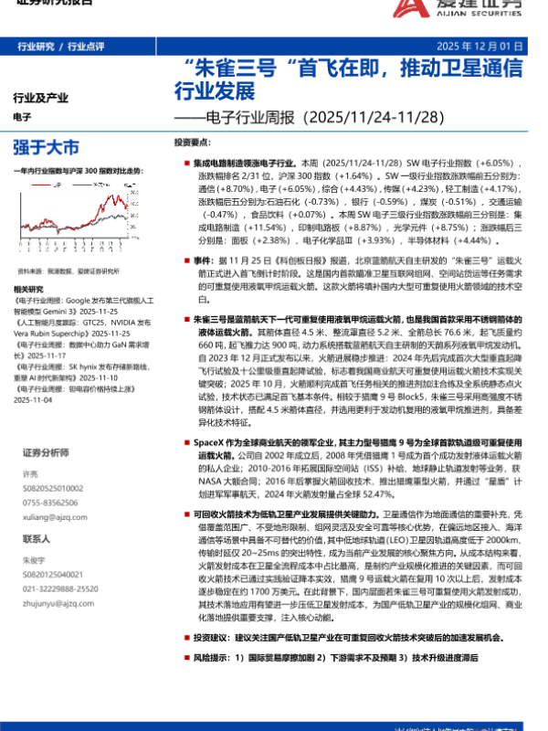 可回收火箭 朱雀三号 电子行业 卫星通信 集成电路