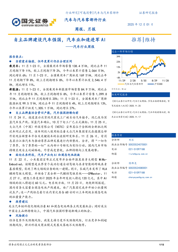 【国元证券】【202511】自主品牌建设汽车强国,汽车业加速进军A I——汽车行业周报-15页