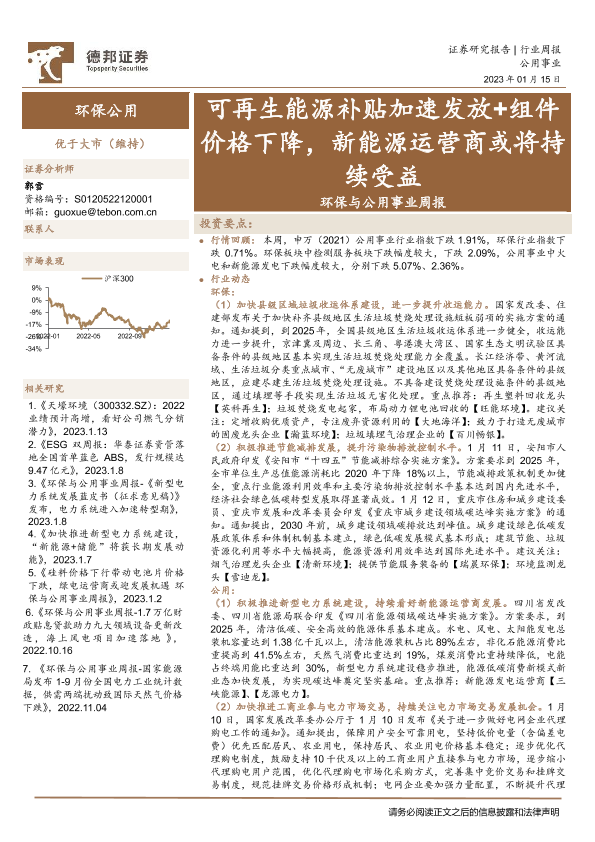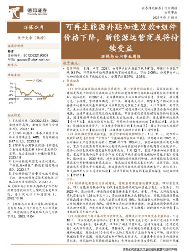 【德邦证券】【20230115】环保与公用事业行业周报:可再生能源补贴加速发放+组件价格下降,新能源运营商或将持续受益-25页