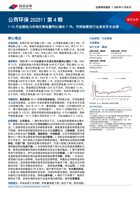 【国信证券】【202511】公用环保行业202511第4期:1-10月全国电力市场交易电量同比增长7.9%,可控核聚变行业资本开支加速-31页