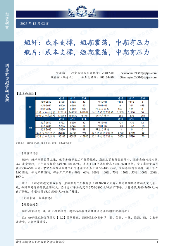 【国泰君安期货】【202512】短纤:成本支撑,短期震荡,中期有压力 瓶片:成本支撑,短期震荡,中期有压力-2页