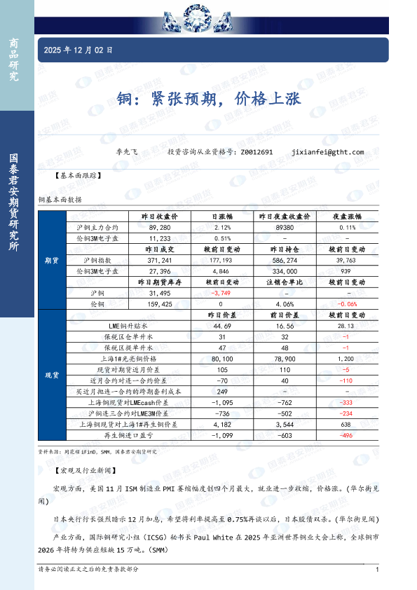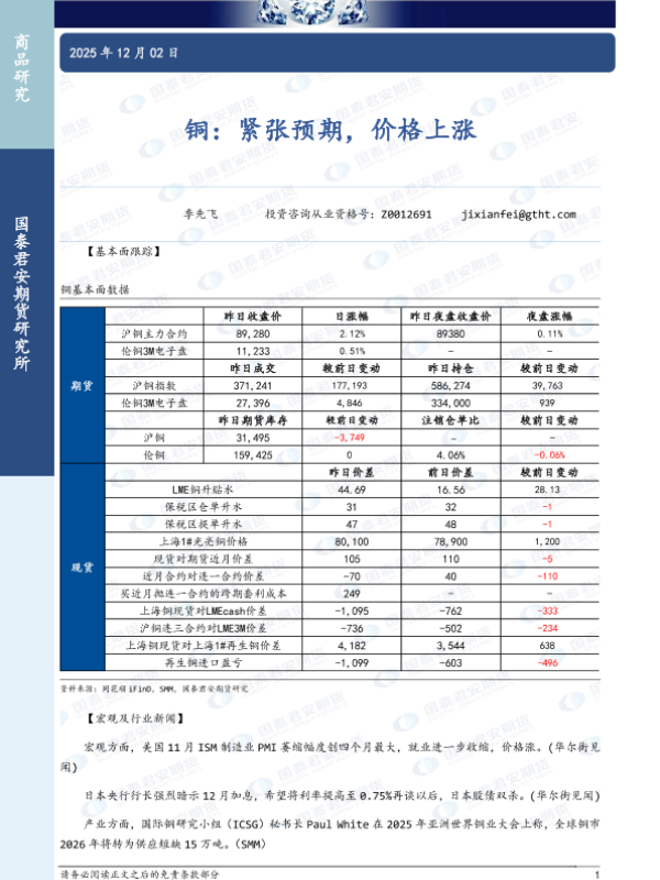 【国泰君安期货】【202512】铜:紧张预期,价格上涨-3页