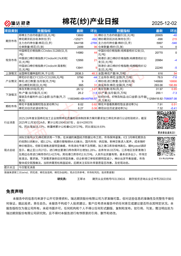 【瑞达期货股份有限公司研究院】【202512】棉花(纱)产业日报-1页
