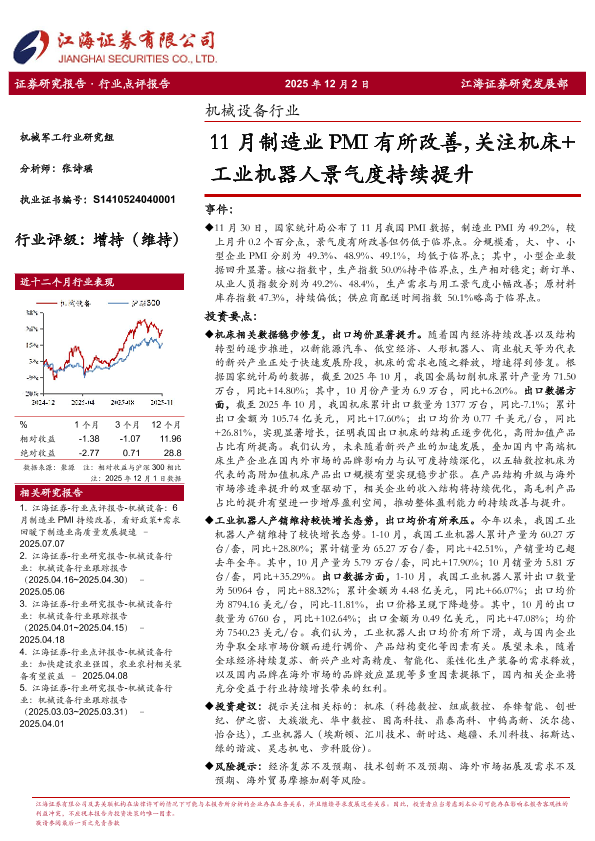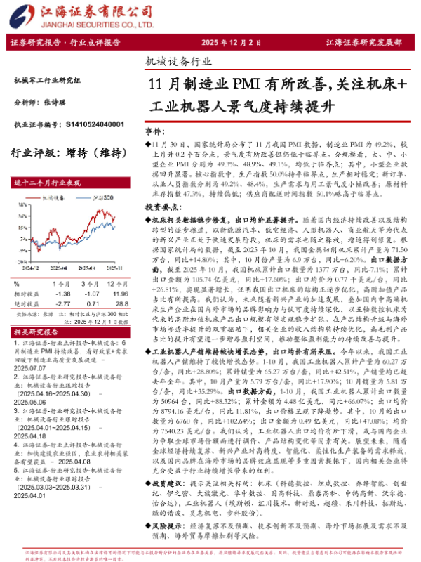【江海证券】【202511】11月制造业PMI有所改善,关注机床+工业机器人景气度持续提升-3页