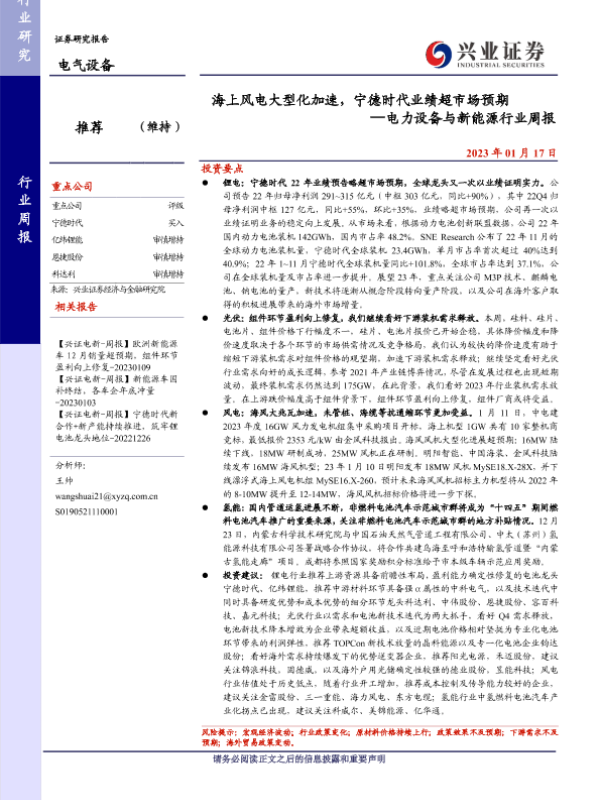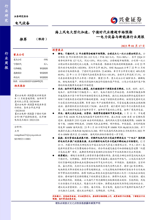 【兴业证券】【20230117】电力设备与新能源行业周报:海上风电大型化加速,宁德时代业绩超市场预期-20页