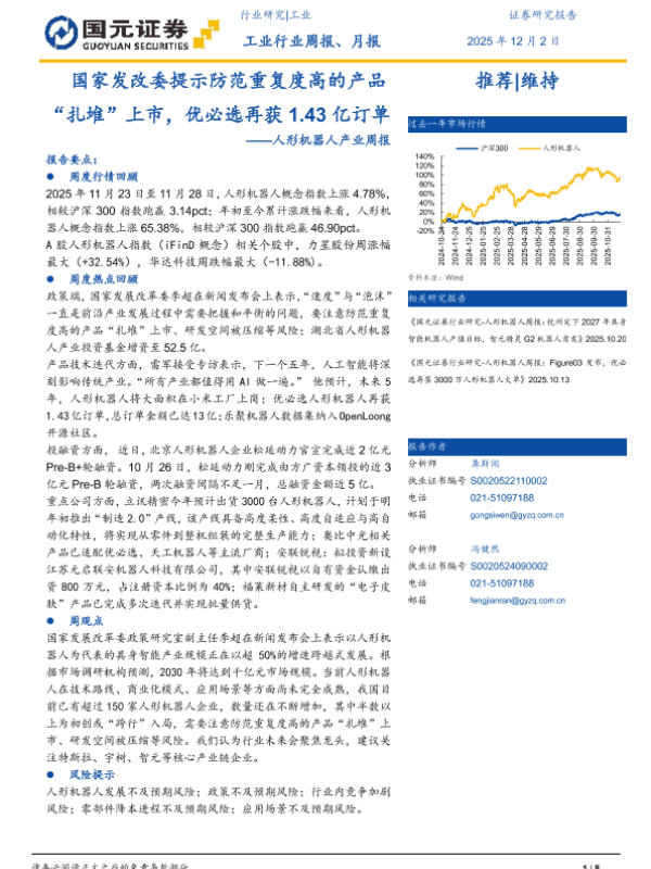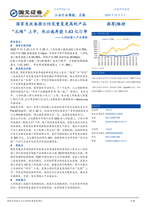 【国元证券】【202511】发改委提示防范重复度高的产品“扎堆”上市,优必选再获 1.43亿订单——人形机器人产业周报-8页