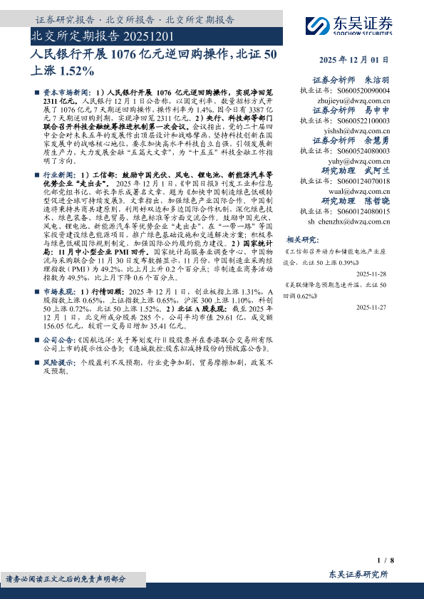 【东吴证券】【202512】人民银行开展1076亿元逆回购操作,北证50上涨1.52%-8页