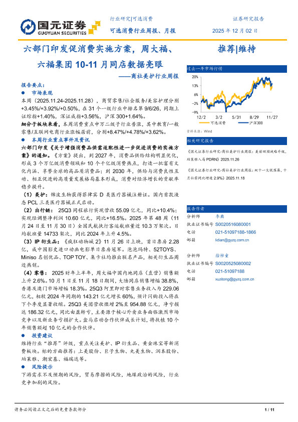 【国元证券】【202511】商社美护行业周报:六部门印发促消费实施方案,周大福、六福集团10-11月同店数据亮眼-11页