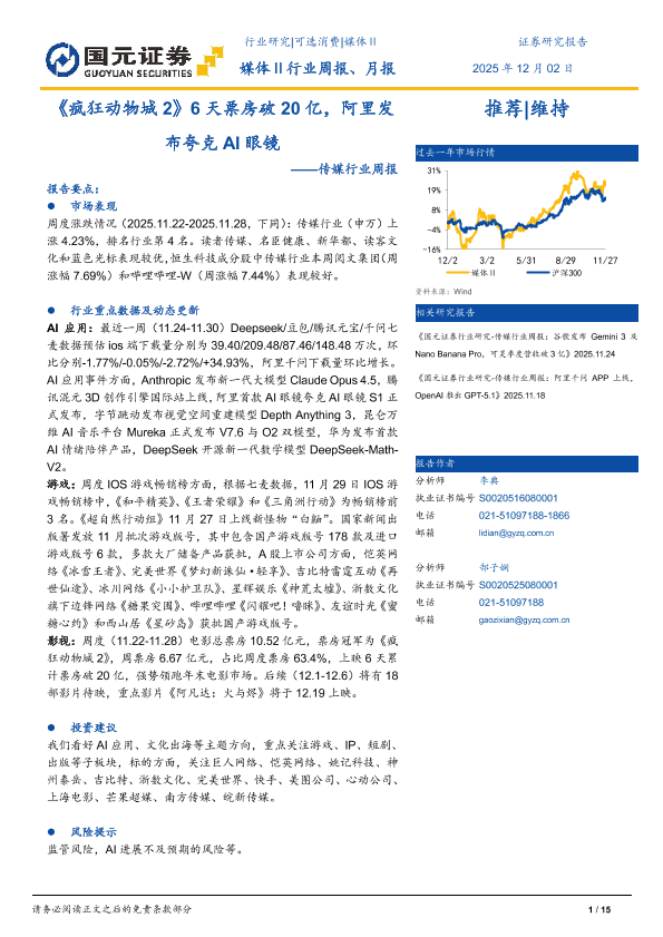 【国元证券】【2025】《疯狂动物城2》6天票房破20亿,阿里发布夸克AI眼镜-15页