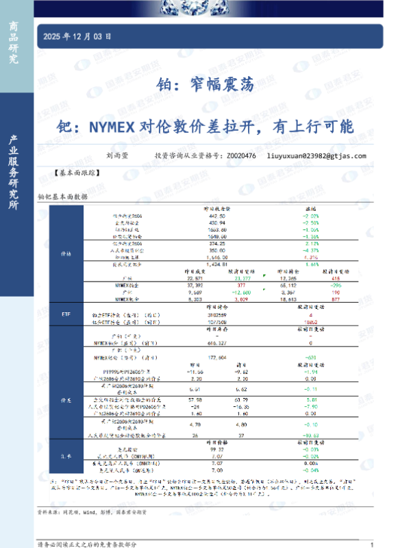 【国泰君安期货】【202512】铂:窄幅震荡;钯:NYMEX对伦敦价差拉开,有上行可能-3页
