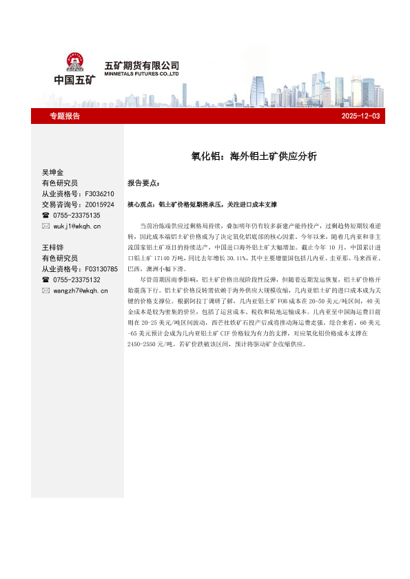 铝土矿 几内亚 进口分析 成本支撑 氧化铝