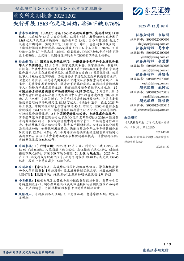 【东吴证券】【202512】央行开展1563亿元逆回购,北证下跌0.76%-9页