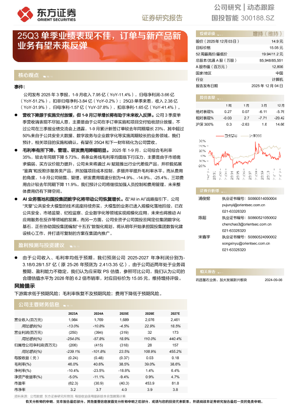 【东方证券】【202512】国投智能动态跟踪 —— 25Q3单季业绩表现不佳,订单与新产品新业务有望未来反弹-5页