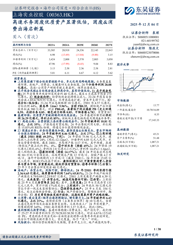 固废处理 高股息 上海实业控股 消费出海 基建环保