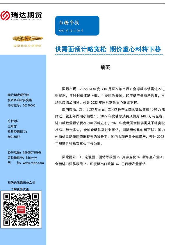 【瑞达期货】【20221220】白糖年报:供需面预计略宽松,期价重心料将下移-21页