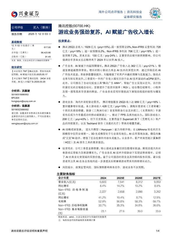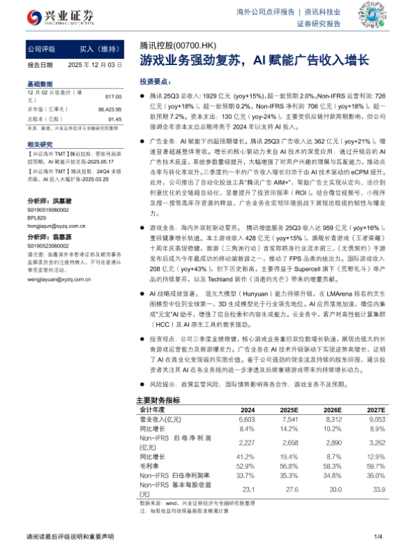 【兴业证券】【202512】腾讯控股:游戏业务强劲复苏_AI赋能广告收入增长-4页