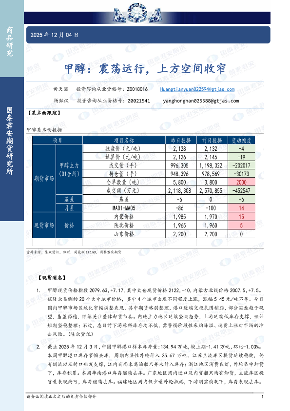 【国泰君安期货】【202512】甲醇:震荡运行,上方空间收窄-3页