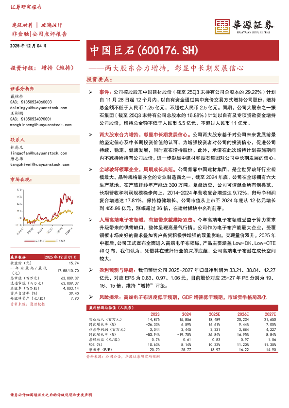 玻纤行业 中国巨石 投资评级 股东增持 高端电子布
