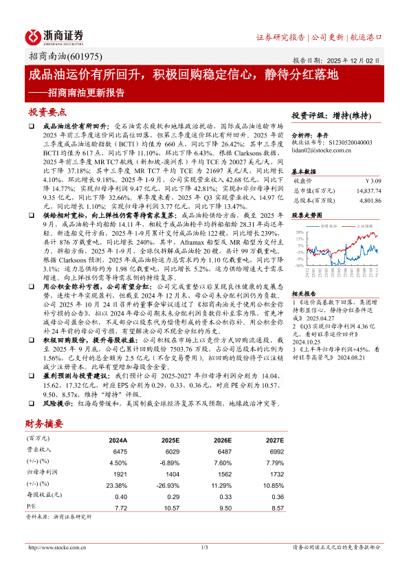 【浙商证券】【202512】成品油运价有所回升,积极回购稳定信心,静待分红落地——招商南油更新报告-3页