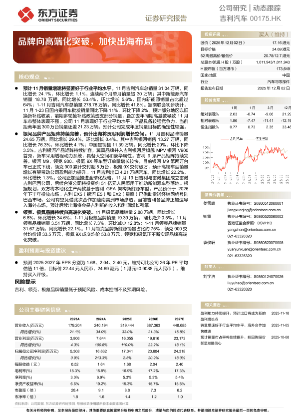 海外市场拓展 高端品牌建设 新能源汽车 汽车行业 盈利预测