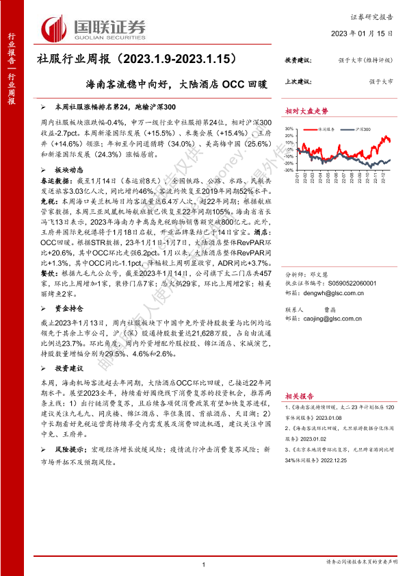 【国联证券】【20230115】社服行业周报:海南客流稳中向好,大陆酒店OCC回暖-14页