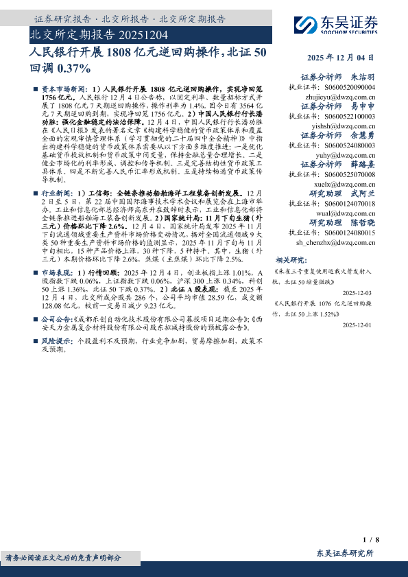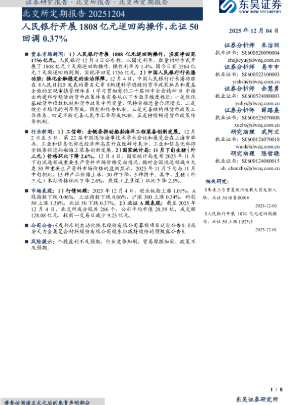 【东吴证券】【202512】人民银行开展1808亿元逆回购操作,北证50回调0.37%-8页