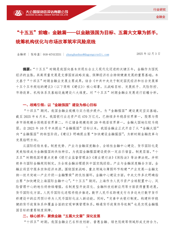 【大公国际】【202512】“十五五”前瞻:金融篇——以金融强国为目标、五篇大文章为抓手,统筹机构优化与市场改革筑牢风险底线-5页