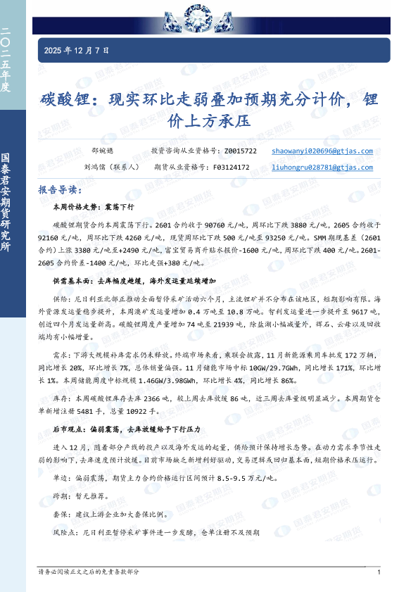 【国泰君安期货】【202512】碳酸锂:现实环比走弱叠加预期充分计价,锂价上方承压-9页