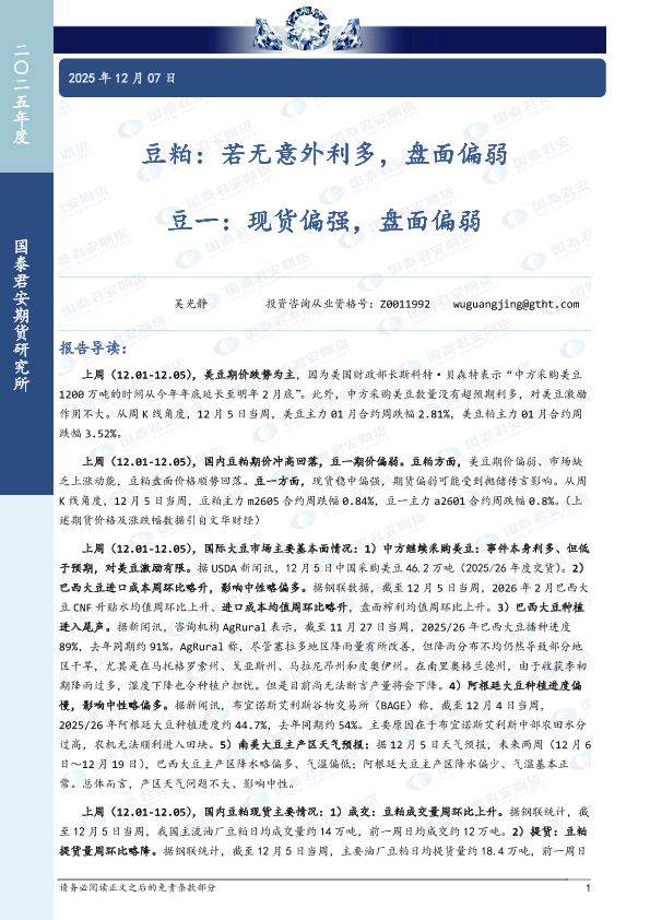 【国泰君安期货】【202512】豆粕:若无意外利多,盘面偏弱;豆一:现货偏强,盘面偏弱-6页