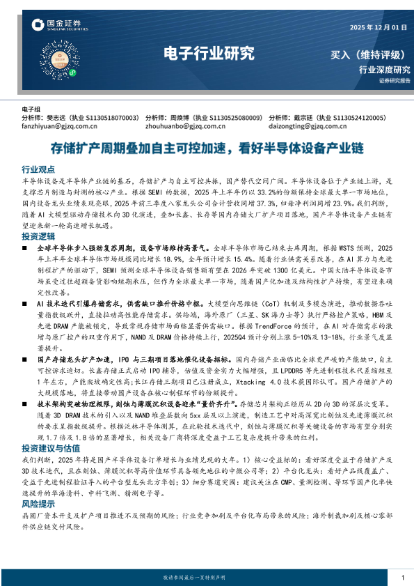 【国金证券】【2025】存储扩产周期叠加自主可控加速,看好半导体设备产业链-22页