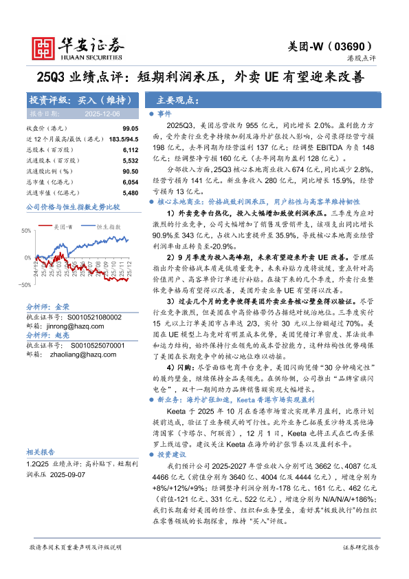 【华安证券】【202512】25Q3业绩点评:短期利润承压,外卖 UE有望迎来改善-4页