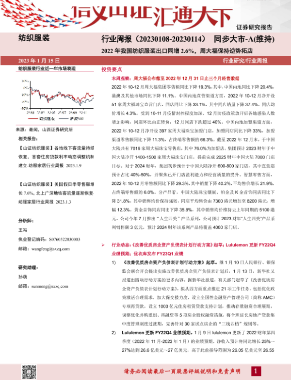【山西证券】【20230115】纺织服装行业周报:2022年我国纺织服装出口同增2.6%,周大福保持逆势拓店-23页