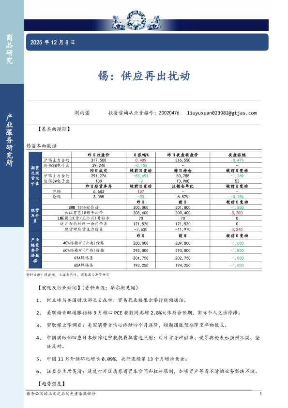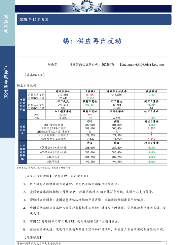 锡 基本面分析 产业链价格 期货市场 供应扰动