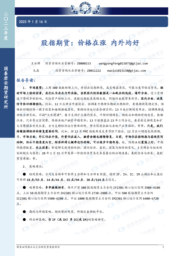 【国泰君安期货】【20230116】股指期货:价格在涨,内外均好-18页
