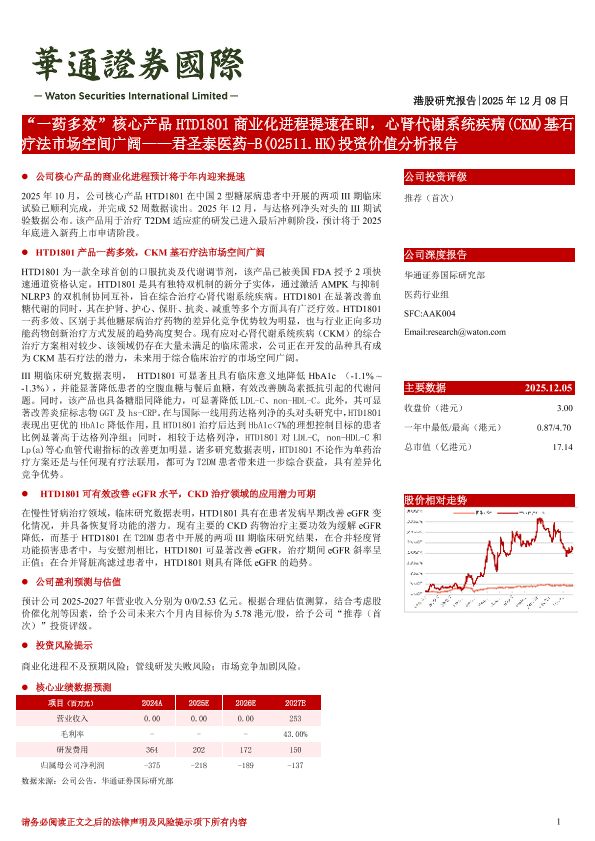 【华通证券国际】【202512】一药多效核心产品 HTD1801商业化进程提速在即,心肾代谢系统疾病(CKM)基石疗法市场空间广阔——君圣泰医药-B(02511.HK)投资价值分析报告-22页