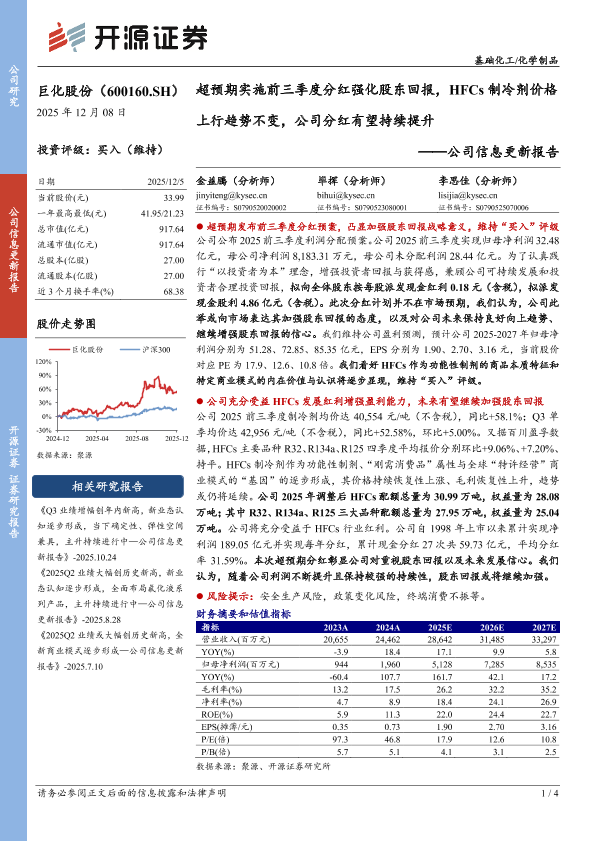 盈利预测 HFCs制冷剂 财务分析 投资评级 分红
