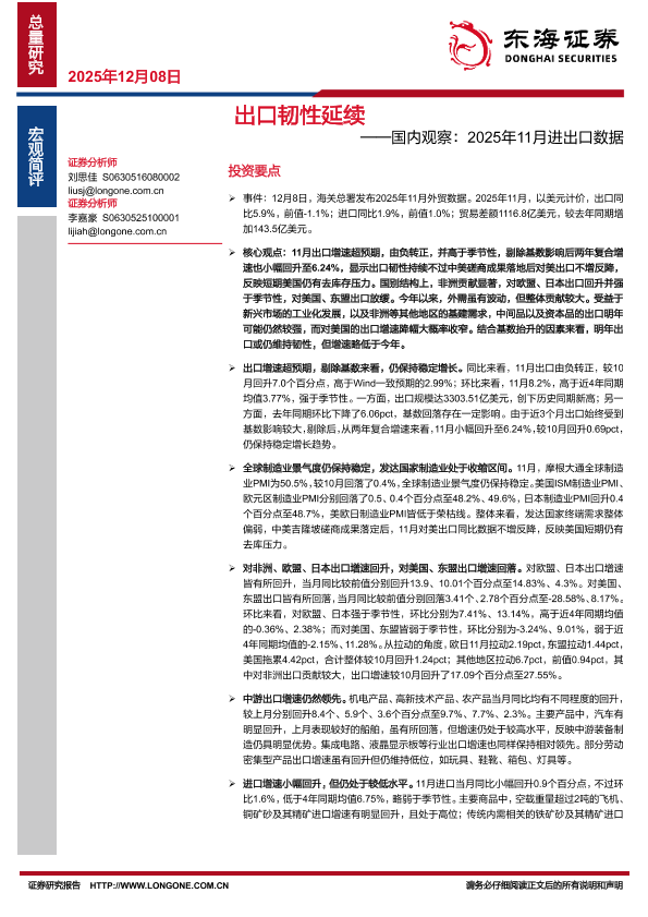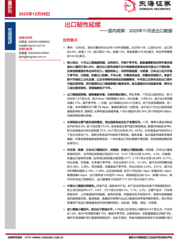 【东海证券】【2025】出口韧性延续——国内观察:2025年11月进出口数据-7页
