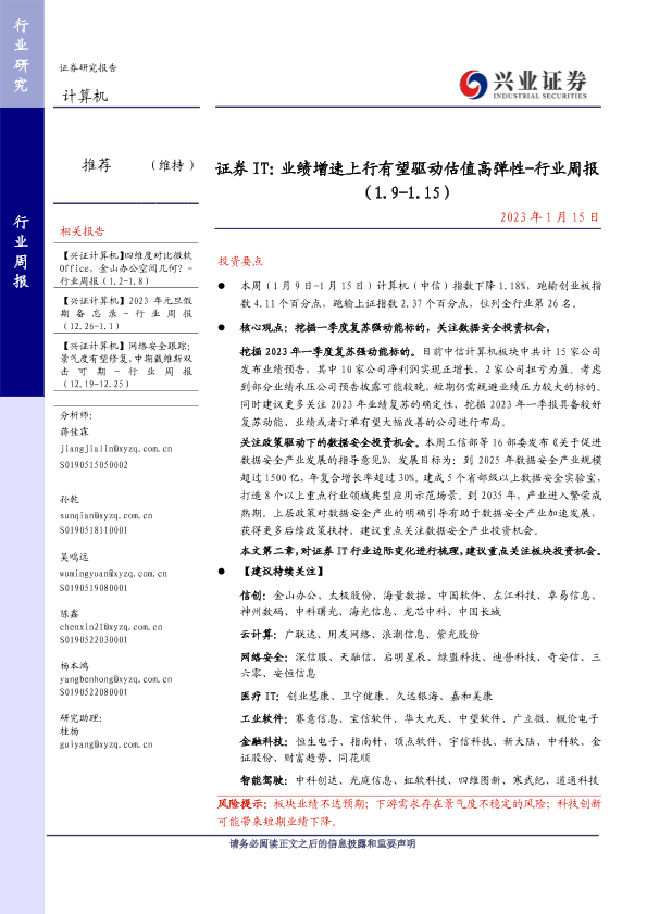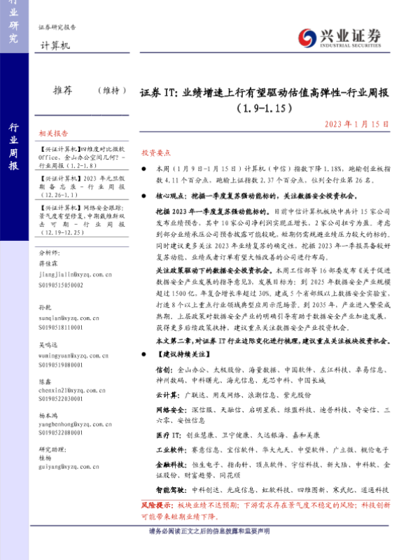 业绩增速 投资机会 数据安全 计算机行业 证券IT
