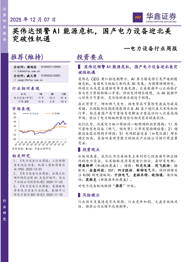 【华鑫证券】【202512】英伟达预警 AI能源危机,国产电力设备迎北美 突破性机遇-18页